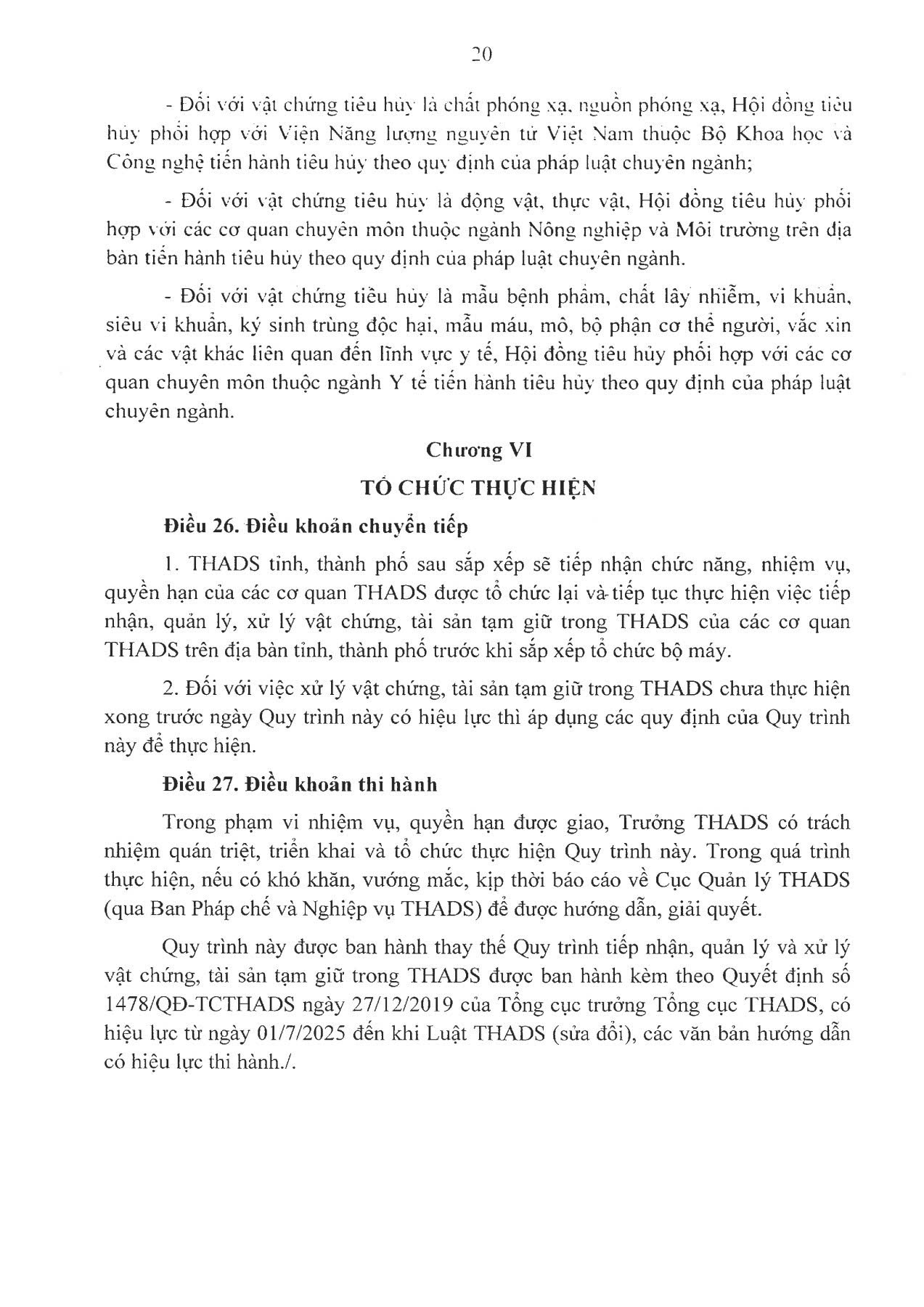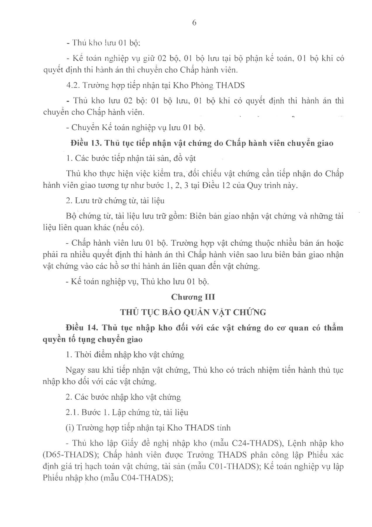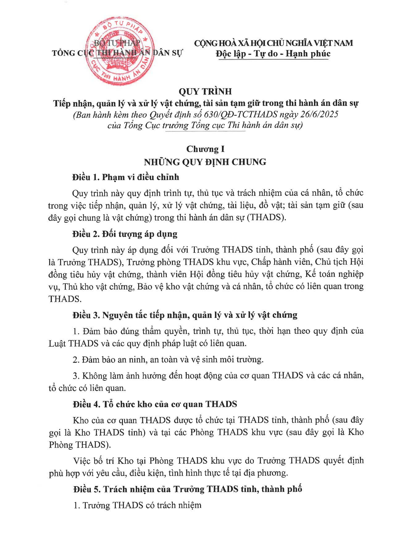 Quy trình tiếp nhận, quản lý và xử lý vật chứng, tài sản tạm giữ trong thi hành án dân sự (kèm theo QĐ 630) Tháng Mười Một 11, 2025 | Không có phản hồi FILE PDF: Quy trình-tiep nhan quan ly vat chung-kèm QĐ 630 Quyết định 630: QUYẾT ĐỊNH SỐ: 630/QĐ/TCTHADS NGÀY 26-6-2025: Quyết định về việc ban hành một số Quy trinh trong nội bộ cơ quan thi hành án dân sự Văn Bản Pháp Luật